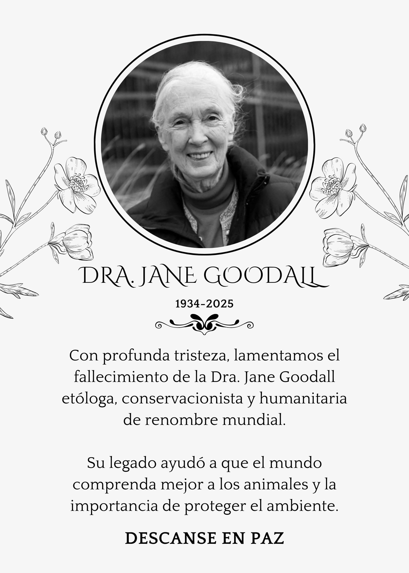 Con profunda tristeza, lamentamos el fallecimiento de La Dra. Jane Goodall fundadora del Instituto Jane Goodall, Mensajera de la Paz de las Naciones Unidas, etóloga, conservacionista y humanitaria de renombre mundial, murió a la edad de 91 años por causas naturales.