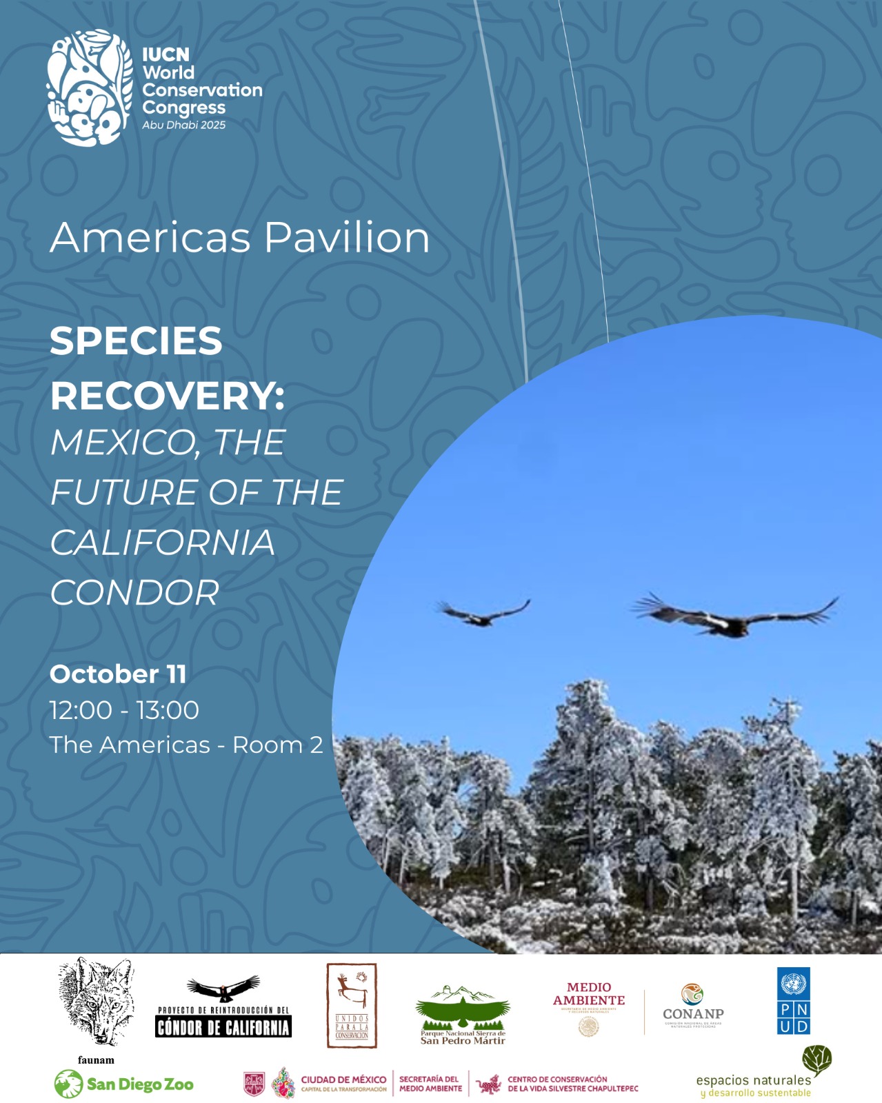 En esta sesión, los responsables del proyecto de reintroducción del Cóndor de California en México compartirán su experiencia de más de 20 años. Contaremos con la participación del Coordinador de la CSE de la UICN, así como de los coordinadores de los grupos de especialistas en Reintroducciones y “Vultures”, junto con actores de EE.UU. y Brasil, quienes resaltarán la relevancia internacional del proyecto y lo contrastarán con otros esfuerzos internacionales y comentarán los retos implícitos. También participarán representantes de comunidades indígenas y del sector privado, quienes expondrán las estrategias de promoción y obtención de apoyos. Se espera la presencia de autoridades de México y EE.UU. que han respaldado el proyecto. Como parte de la sesión, se presentará un breve video, una muestra fotográfica y se otorgará en el marco del evento cuatro reconocimientos. Destacando la cooperación internacional, los logros alcanzados y los retos futuros en la conservación de la especie.